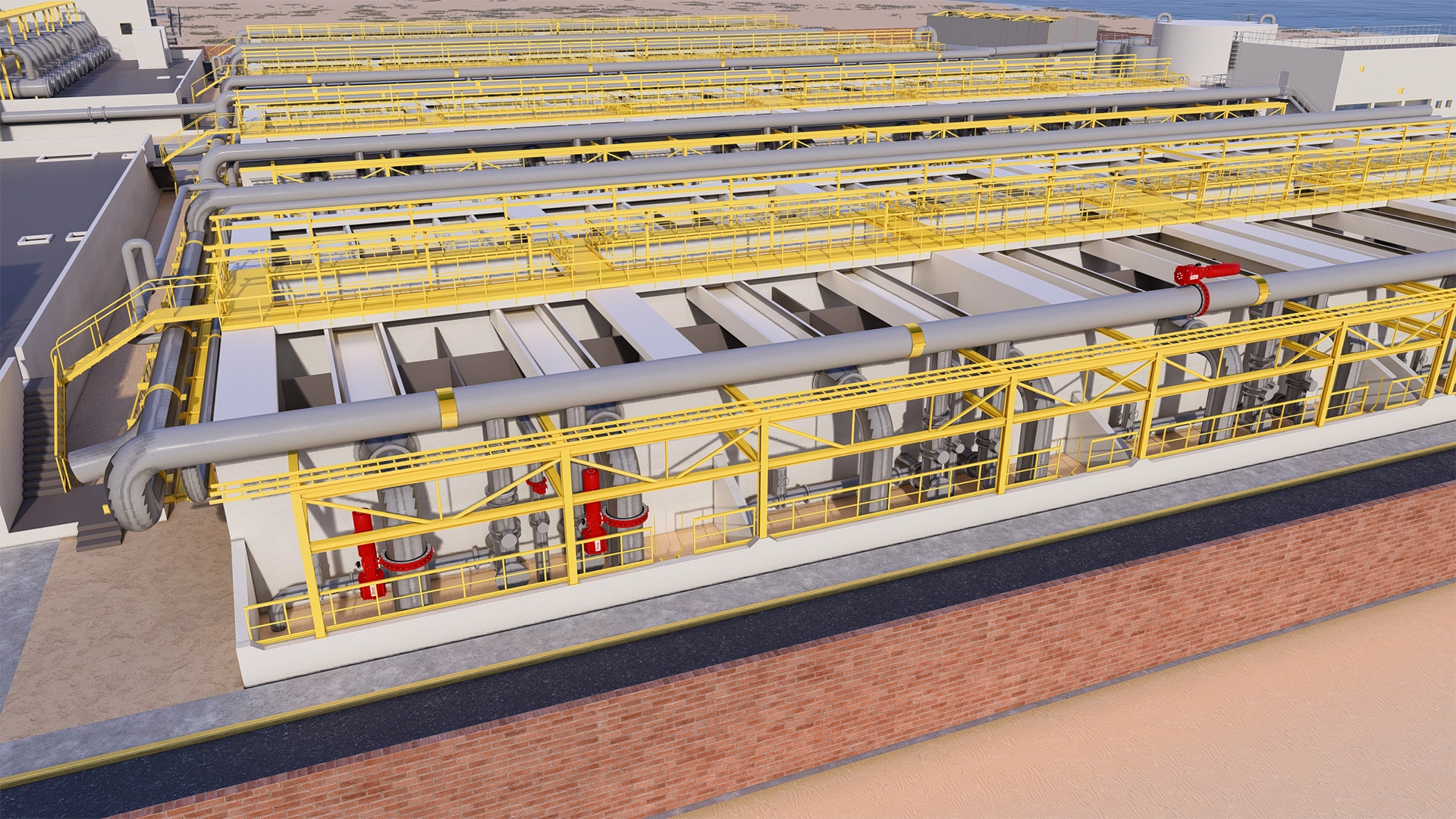 Seawater is drawn from the source (e.g., ocean) through an intake structure, often designed to minimize the impact on marine life.