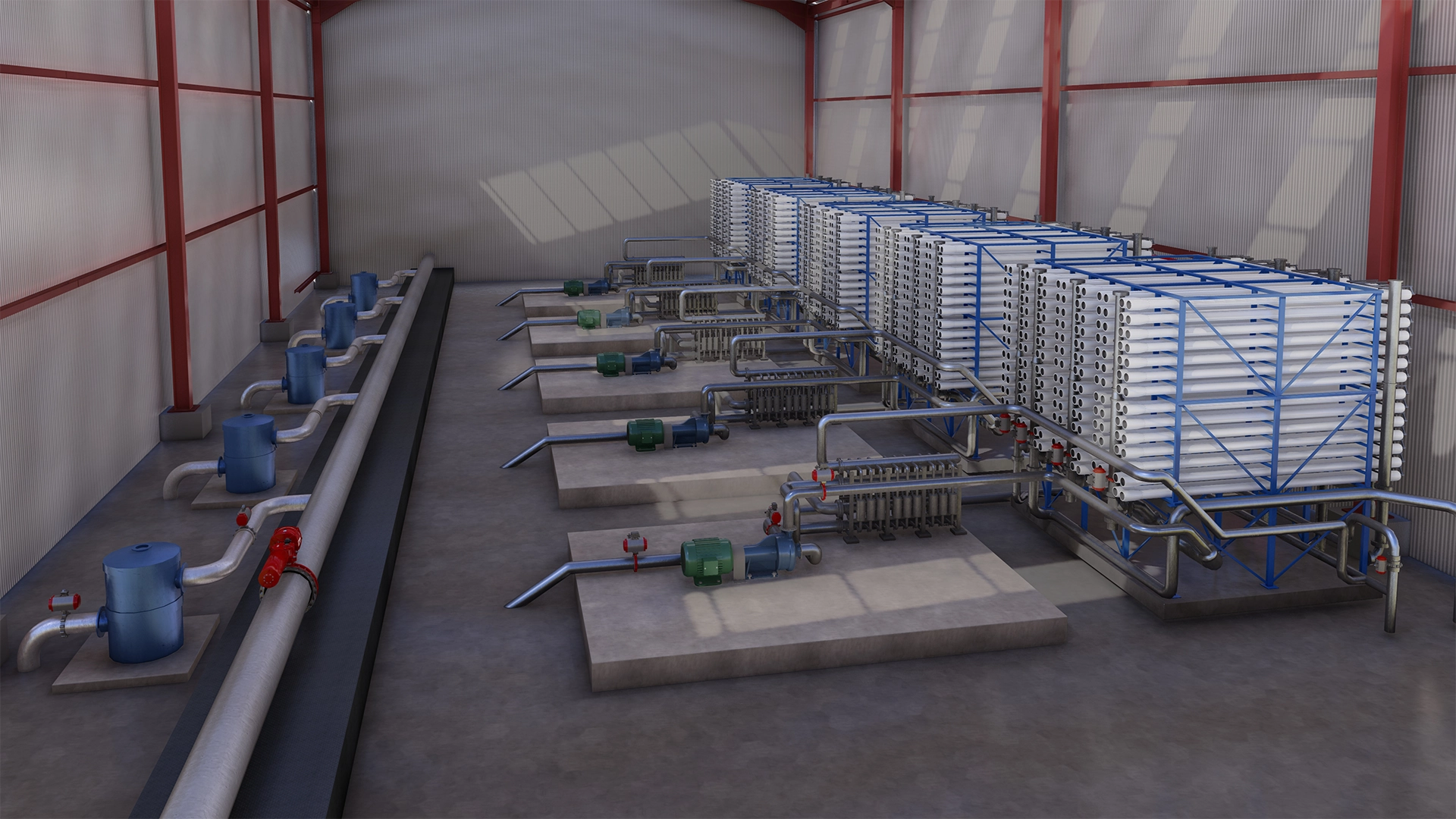 The pretreated seawater is pressurized and forced through semi-permeable membranes. This process separates the seawater into fresh water (permeate) and a concentrated salt stream (brine).